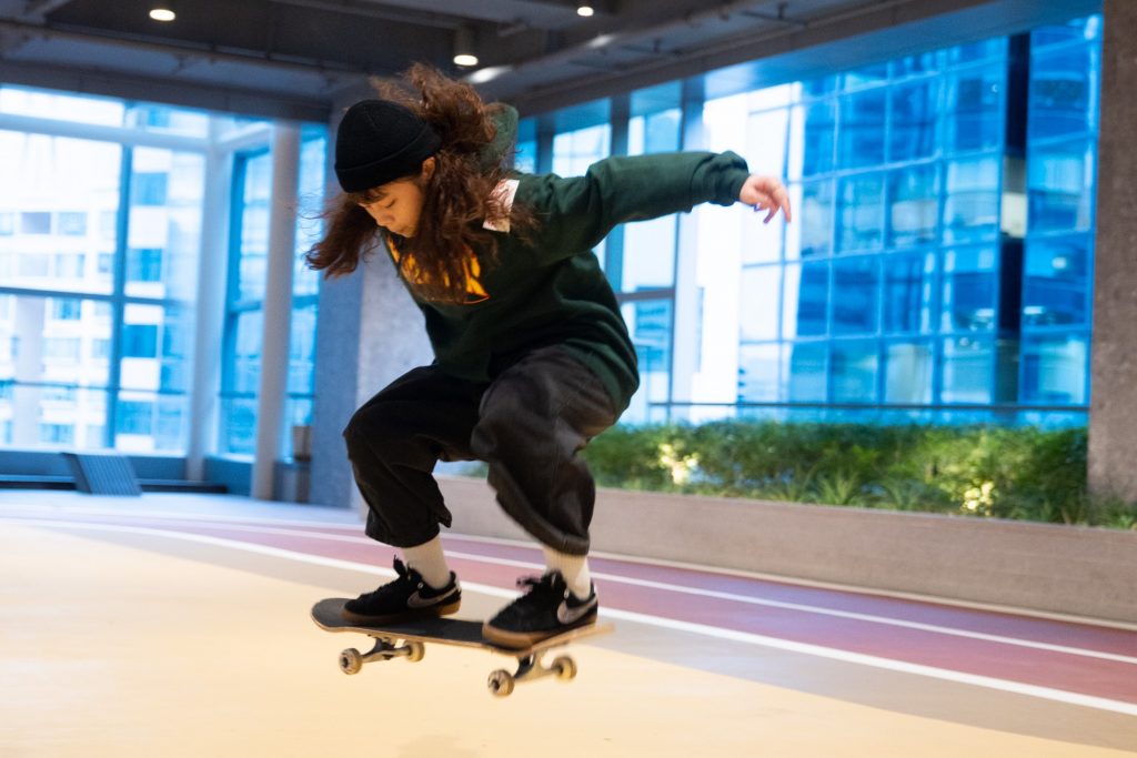 滑板運動只適合男生參加?現年 19 歲的細菇是本地的女滑板手,因看到板場上滑板手的型酷身影,就自置一塊滑板,於滑板場上一邊觀察一邊自學,亦因為滑板而認識到一些志同道合的朋友,更會不時相約到滑板場練習,互相學習。