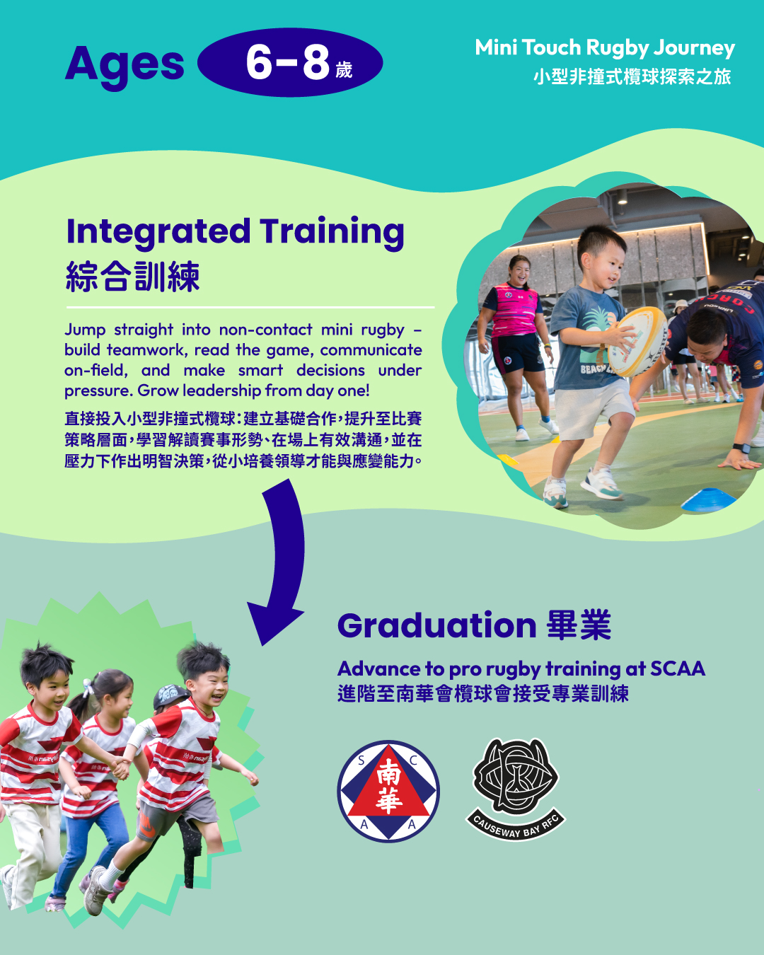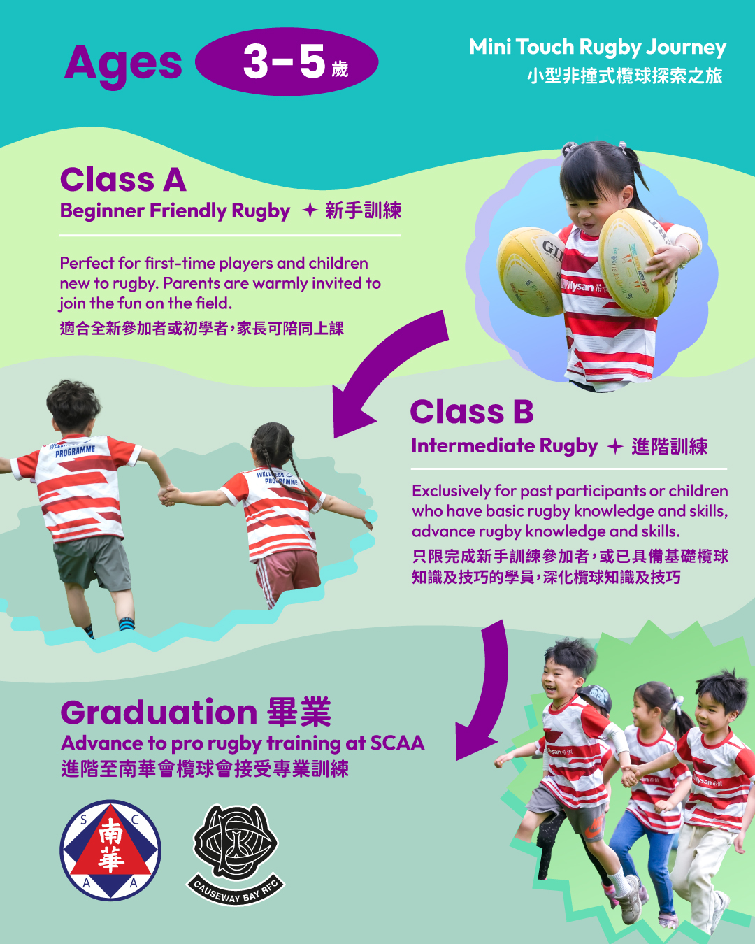 專業系統訓練:採用World Rugby「Get Into Rugby」啟蒙課程,專為幼童設計,由南華會銅鑼灣欖球會的專業教練團隊指導。