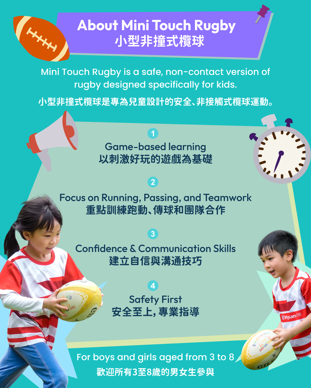 加入利園區小型非撞式欖球訓練班,一個專為3-8歲幼童打造的冒險旅程,透過遊戲學習團隊合作,為孩子注入活力與自信!